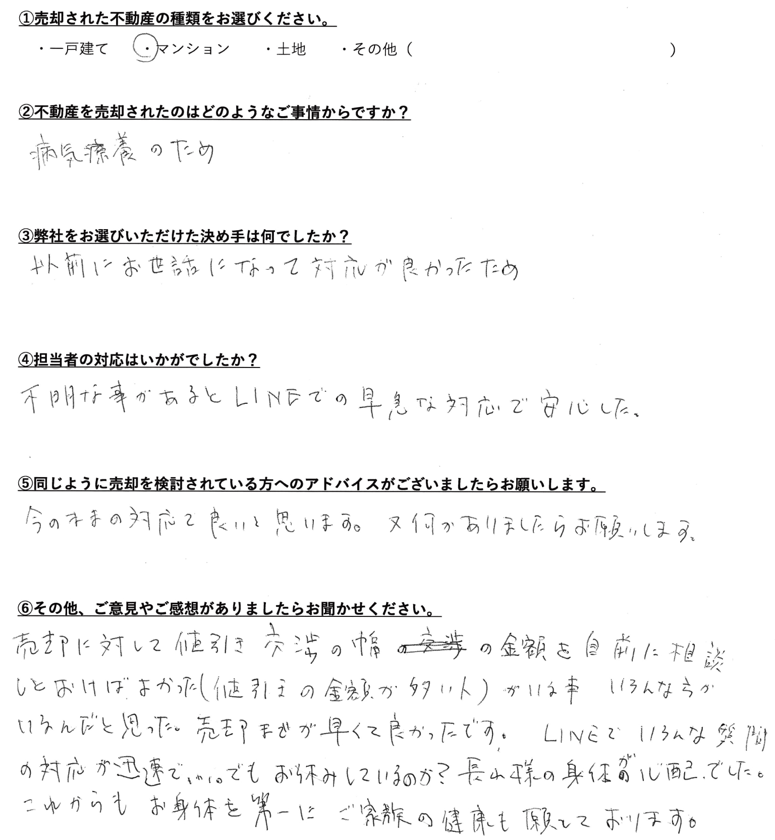 売主様よりご売却後にいただきましたアンケートをご紹介いたします。