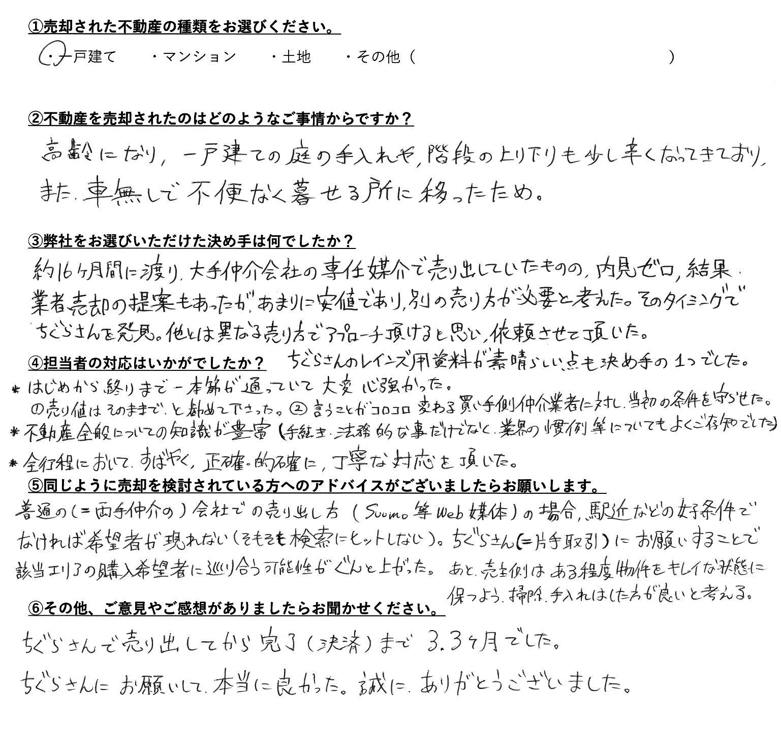 売主様よりご売却後にいただきましたアンケートをご紹介いたします。